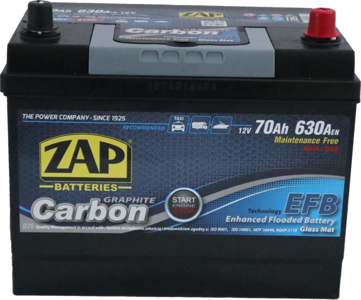 ZAP Baterie auto 70Ah Zap Carbon Japan EFB Start-Stop 260x175x220 630A 12V, polaritate inversa 630A
