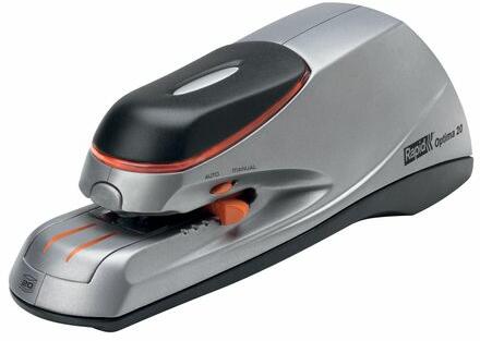 Capsator electric Rapid OPTIMA, 20 coli, argintiu, cu adaptor și 1000 capse Optima 56 incluse Transformă capsarea documentelor într-o activitate rapidă, precisă și fără efort cu capsatorul electric Rapid OPTIMA . Ideal pentru birouri, recepții sau casierii, acest capsator compact permite capsarea până la 20 de coli (80 gsm) , fie complet automat, fie manual prin apăsarea pe partea frontală.