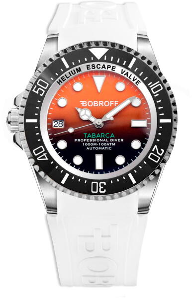 type_ofmechanism: AUTOMATICdisplay: ANALOGICALmaterial_of_case: STAINLESS STEELcolour_of_case: SILVERmaterial_of_bracelet: RUBBERcolour_of_bracelet: WHITEdial_colour: ORANGEglass_type: SAPPHIREclousure: BUCKLEwater_resistence: 100ATMdiameter_dial: 44MMspecial_functions: Tabarca collection. NH35 Automatic caliber - Brushed and polished stainless steel box 316L - 44mm x 17mm - Unidirectional Luminescent Ceramics with 120 Clicks - Water Resistant 1,000 meters - 100atm - 4.5mm Zafiro Crystal with anti -reflexes - Crown to Rosca - Luminescent needles and indices in light blue - hand -degraded color sphere, the final finish can differ a little of the photos shown - 316L steel strap with screwed links and expansion for diving suit - helium valve - Loading Load Reserve of 41h